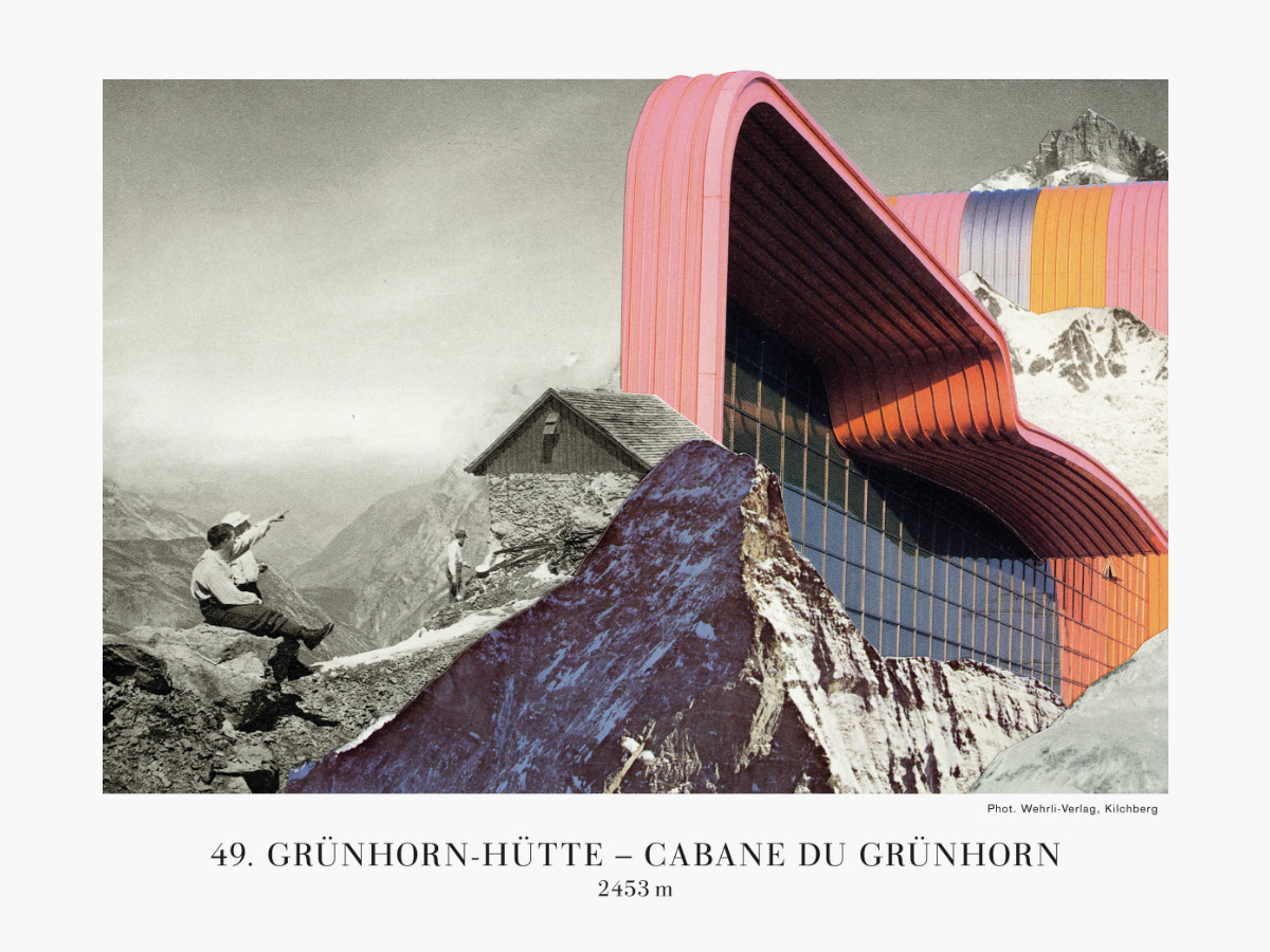 Nun legt Esther Wicki-Schallberger, 85 Jahre nach dem Erscheinen der Publikation, das Clubhüttenalbum in einer neuen Gestalt vor. Mit ihrer Collagetechnik des Schneidens, des Austauschens und Ersetzens, des Verpflanzens, Akzentuierens oder Integrierens, mit verfremdenden Einblicken und Aussichten, mit Abriss und Anbau, mit Einbrüchen von diametral entgegengesetzten Welten, mit ausdünnen und anreichern, mit Versatzstücken quer durch die Architektur- und Kunstgeschichte, die im Bild auftauchen, wirkt sie dem Altwerden entgegen und dient den aktuellen Bedürfnissen.